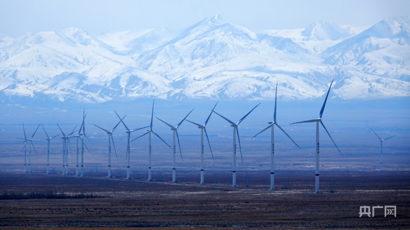 雪山下的風(fēng)力發(fā)電機組(央廣網(wǎng)記者 張海東 攝)