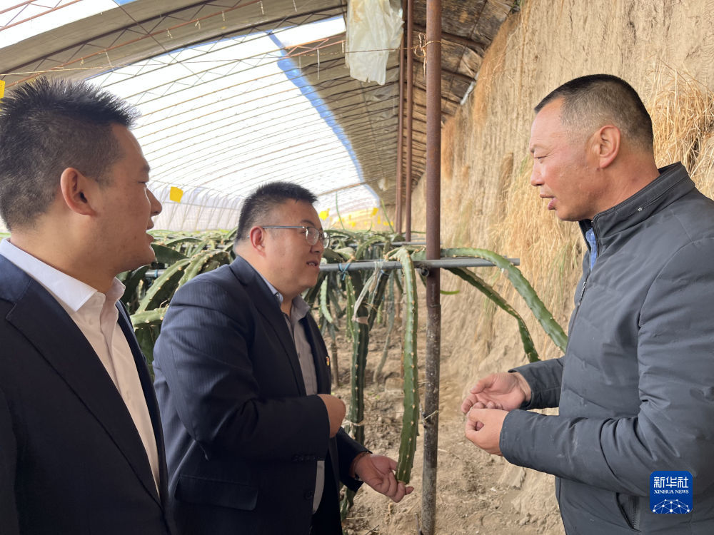 2月24日,郭存海(右)向銀行工作人員介紹火龍果生長(zhǎng)情況。新華社記者 解統(tǒng)強(qiáng) 攝