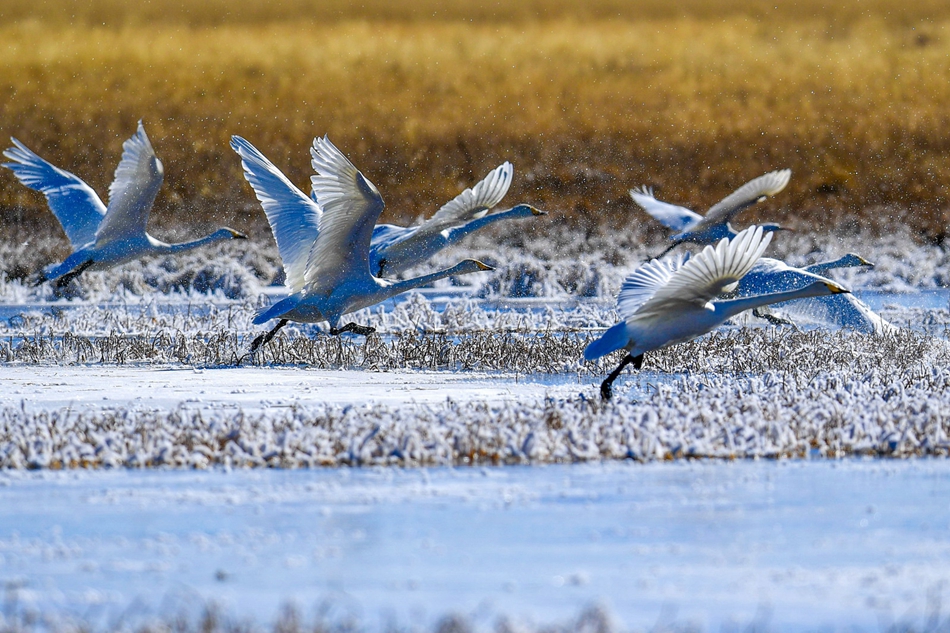 入冬以來,甘肅省甘南藏族自治州碌曲縣尕海濕地越冬的大天鵝浴雪歡歌,翩翩起舞,成為草原上一道獨(dú)特的風(fēng)景。[詳細(xì)] -