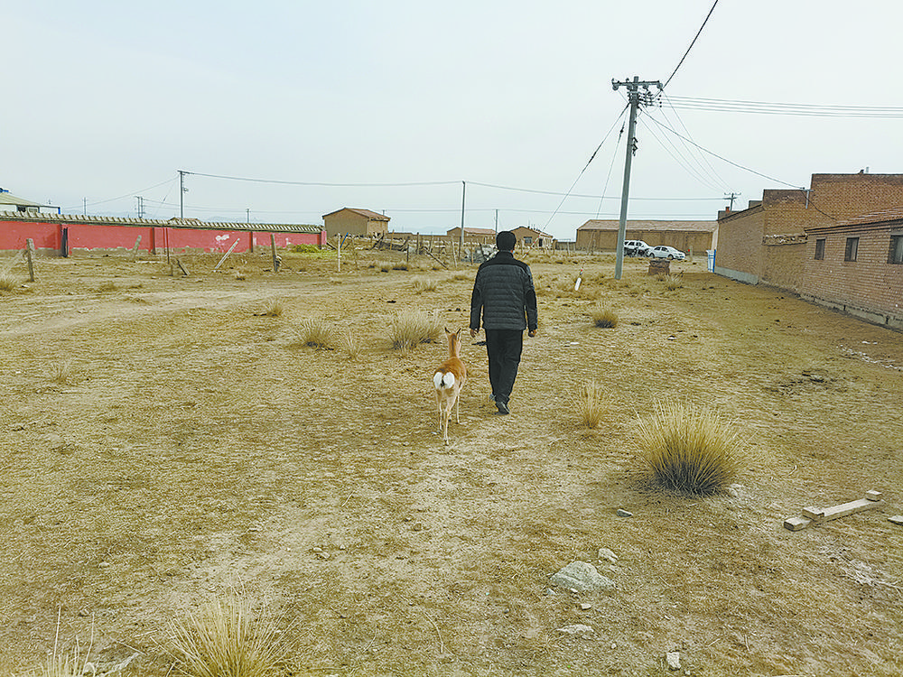 半個多月來,盡管我們已經(jīng)習(xí)慣了目睹一只普氏原羚與牧人形影不離的場景,但每當(dāng)凝望那片草色枯黃的原野,牧人周增本無論走向何處,一只小原羚總是在6、7米外不緊不慢地跟隨著他,心里便會涌起一種無以名狀的感動,不禁令人熱淚盈眶。