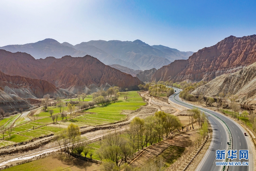 公路蜿蜒在丹霞峽谷中,四周山脈層層疊起,工整而靈動,風(fēng)景絕美。新華網(wǎng) 宋忠勇 攝