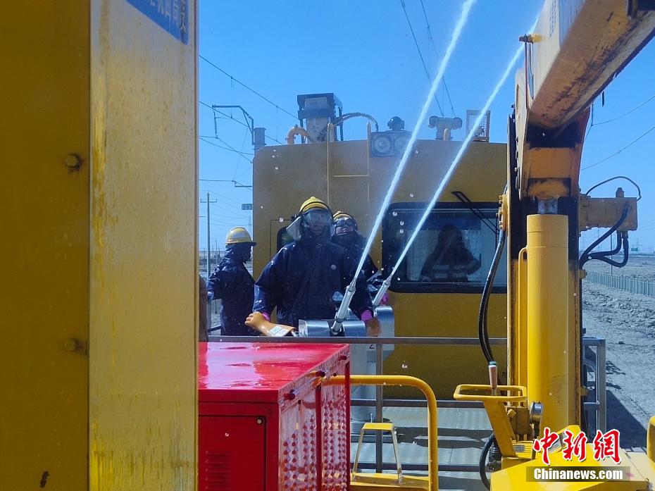 察爾汗鹽湖區(qū)域空氣中鹽分含量高,在這片區(qū)域,春秋季大風不僅揚沙還會揚鹽,很容易在鐵路牽引供電接觸網(wǎng)設備上形成鹽污,造成線路跳閘,遇到雨雪天氣就會放電,造成大面積跳閘,誘發(fā)行車安全事故。圖為接觸網(wǎng)工操作水炮進行清洗作業(yè)。 王文誠 攝