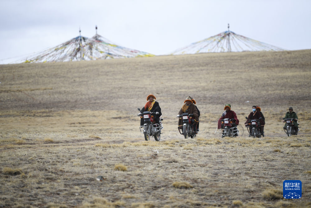 4月21日,在青海省玉樹藏族自治州曲麻萊縣麻多鄉(xiāng)約古宗列曲附近,生態(tài)管護員才仁扎西駕駛摩托車巡護。新華社記者 張龍 攝