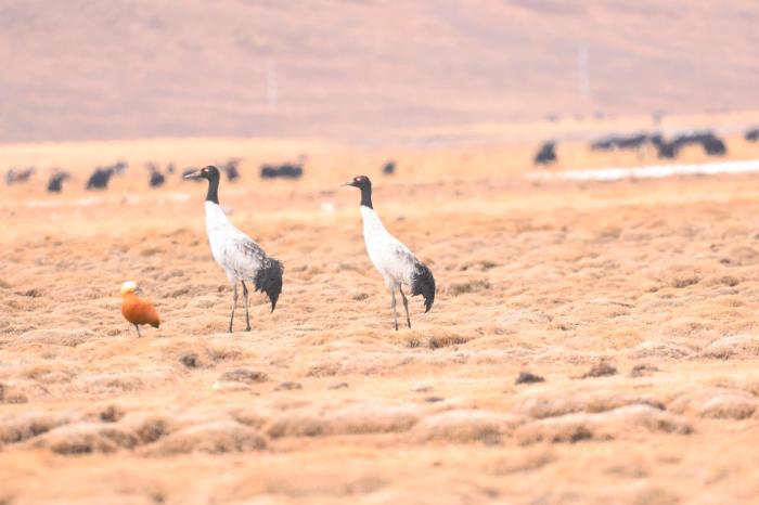 4月開(kāi)始,隆寶國(guó)家級(jí)自然保護(hù)區(qū)匯集了上游冰川融水和淺層地表水,具有開(kāi)闊處似湖泊、蜿蜒處似河流、外圍區(qū)似沼澤的多元濕地斑塊,湖心裸露灘地、湖岸草洲密集,春夏季水位上漲形成“草洲微露,一片海子”的水禽宜居地,為斑頭雁、黑頸鶴及早期繁殖的雁鴨類(lèi)提供營(yíng)巢避敵、繁殖棲息的良好場(chǎng)所和充足的覓食空間。此次調(diào)查共記錄斑頭雁6000余只,黑頸鶴153種,其中有3對(duì)已開(kāi)始孵化。