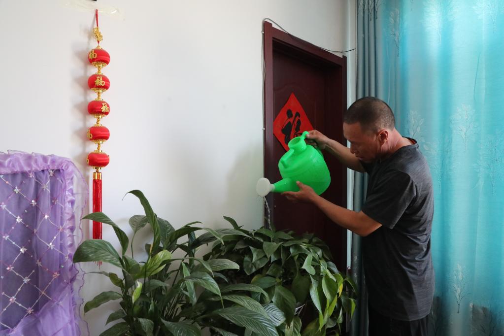 劉長(zhǎng)海在新家里澆花。新華社記者王博攝