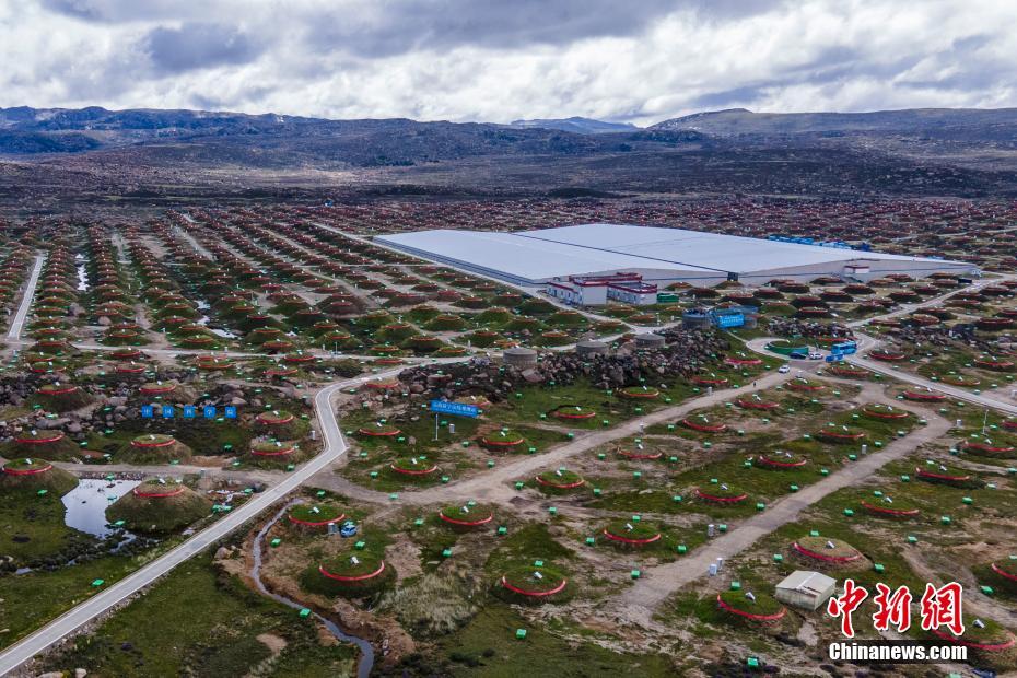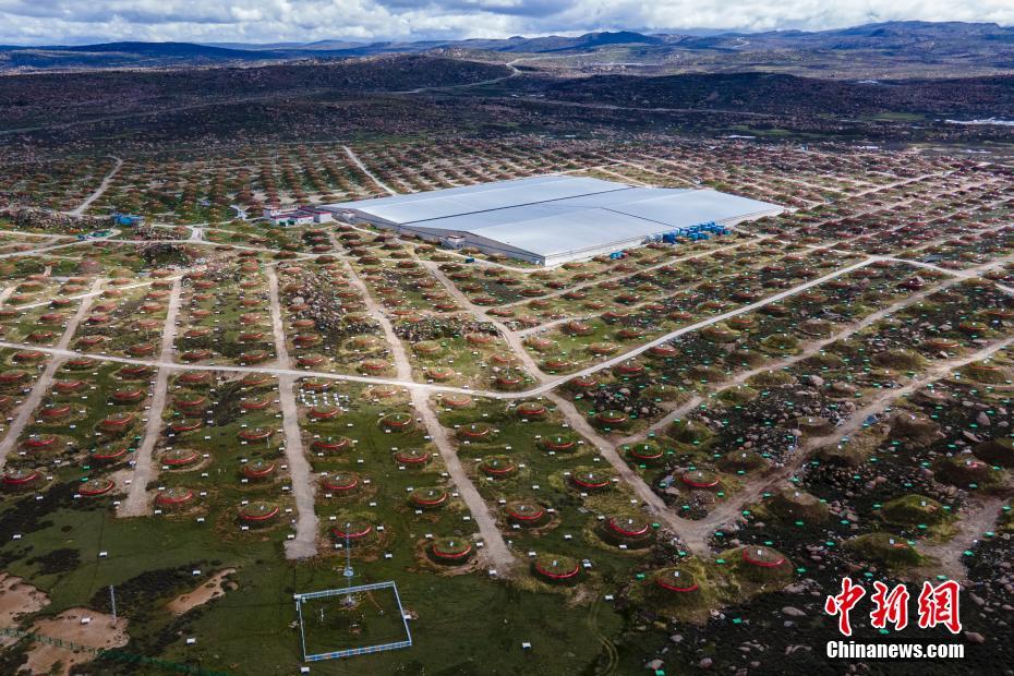 6月28日,四川稻城,觀測(cè)站中間房屋結(jié)構(gòu)為水切倫科夫探測(cè)器。海拔4410米的四川省甘孜州稻城縣海子山,5216個(gè)電磁粒子探測(cè)器和1188個(gè)繆子探測(cè)器,以及占地78000平方米的水切倫科夫探測(cè)器有序分布在1.36平方公里范圍,十分壯觀,這是中國(guó)建設(shè)的第三代高山宇宙線實(shí)驗(yàn)站。中新社記者 劉忠俊