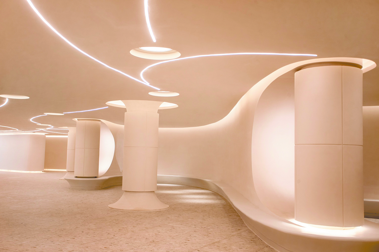 “看見九寨”大樓內(nèi)的10余個(gè)空間里,設(shè)計(jì)團(tuán)隊(duì)用不同的色彩和科技表現(xiàn)手法表達(dá)出不同的舒緩風(fēng)格,治愈人心?!蔼?dú)自醒來”藝術(shù)館運(yùn)用弧形和曲線,將空間切割出曼妙的身形,輕盈靈動(dòng),淺黃柔色的燈光彌漫著溫柔氣息;以白色調(diào)為主的“九寨時(shí)光”圖書館,能讓人從浮躁中快速安靜下來。