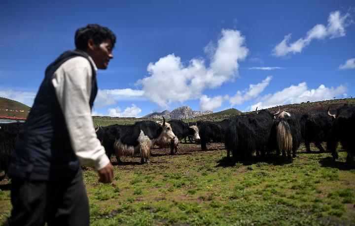 優(yōu)美村生態(tài)畜牧業(yè)專業(yè)合作社牧工準備將牦牛趕往夏季草場。新華社記者 張宏祥 攝