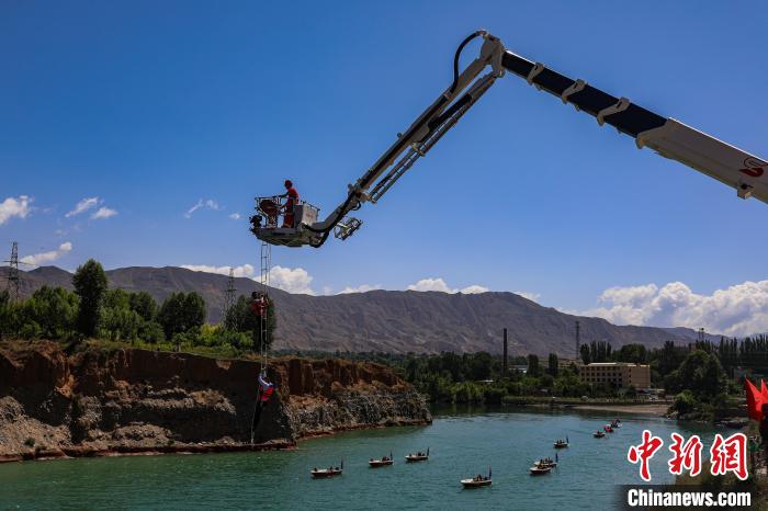 圖為演練現(xiàn)場,登高平臺消防車負(fù)角度峽谷救援。黃開森 攝