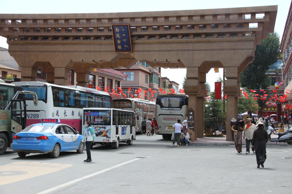 旅游包車游客進入理塘縣勒通古鎮(zhèn)景區(qū)。(理塘縣委宣傳部供圖)