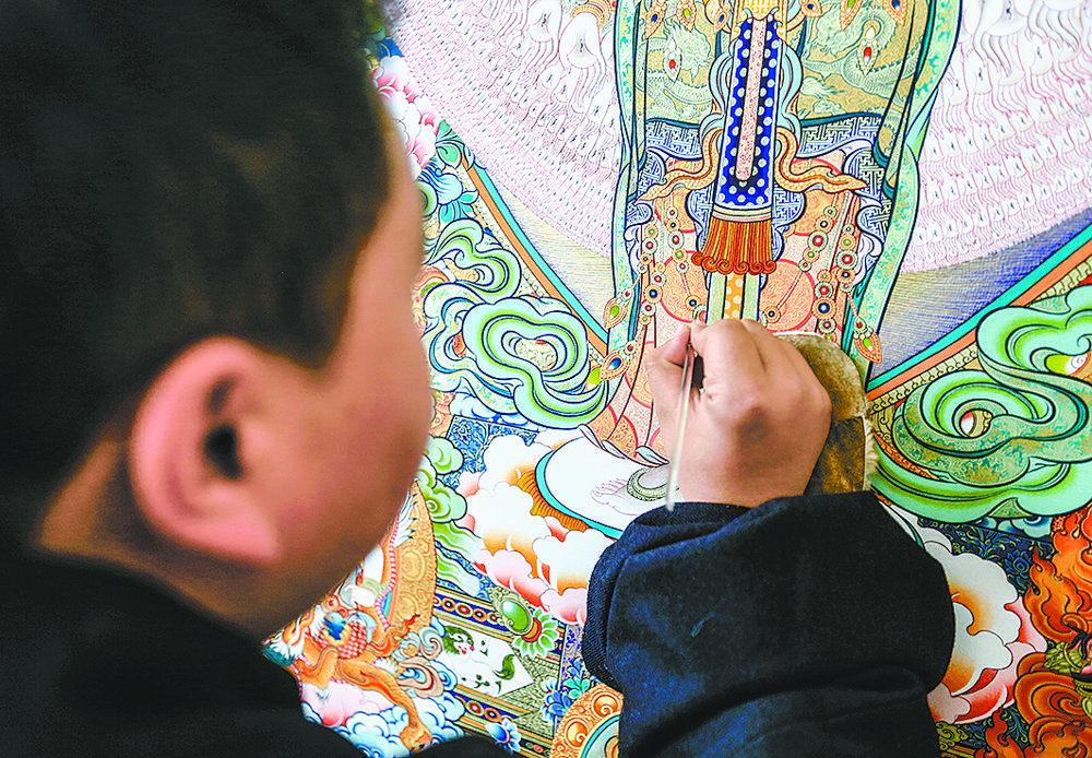 為唐卡上色。人民網(wǎng) 況玉 攝