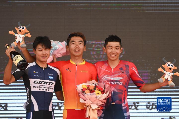 7月31日,獲得當(dāng)日賽段前三的甘肅體彩隊(duì)選手彭鑫(中)、捷安特洲際隊(duì)選手吳俊杰(左)、李寧之星洲際隊(duì)選手牛益逵在領(lǐng)獎(jiǎng)臺(tái)上合影。新華社記者 張龍 攝