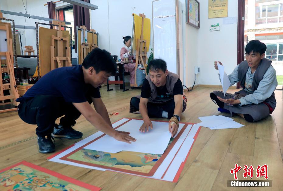 傳習所的老師和學員在裝裱唐卡作品。 王磊 攝