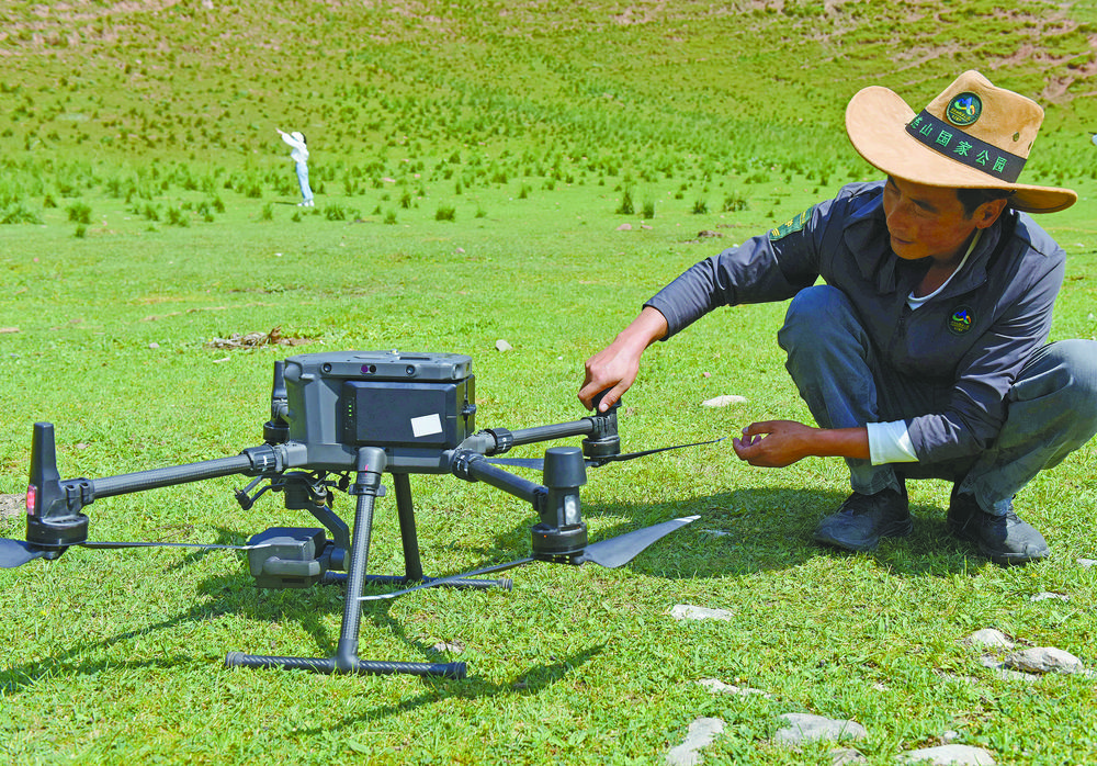 管護(hù)員開展無人機(jī)巡護(hù)前對(duì)無人機(jī)進(jìn)行檢查。