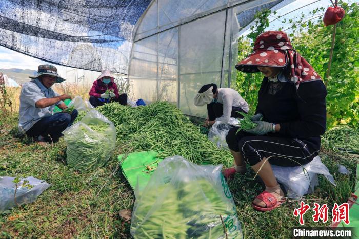 八月中旬,在四川省阿壩藏族羌族自治州壤塘縣的熱布卡蔬菜基地,五月種植的第一批四季豆(學名菜豆,下同)正值豐收。50歲的陳老會年初從云南來到四川壤塘工作,她和工友們將剛采摘的四季豆篩選裝袋,近五十斤重的包裝袋整齊鋪滿地面?!拔覀兿挛绮烧氖卟?,第二天早上就能出現(xiàn)在成都的市場上。”她頭也不抬地忙著手中的活。
