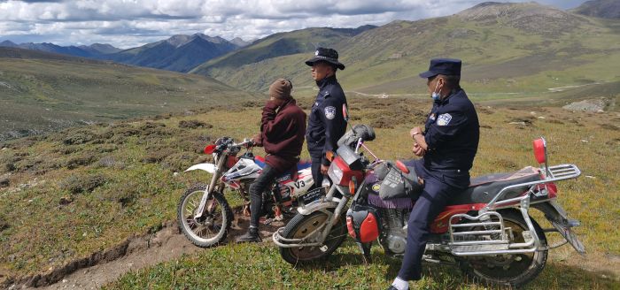 禾尼鄉(xiāng)派出所接到求助后,立即安排在附近開(kāi)展工作的草原騎警隊(duì)警力寧紅玉、澤仁公布、格絨降措帶領(lǐng)熟悉附近地形的派出所群防群治義警隊(duì)員丁真稱(chēng)乃,騎摩托車(chē)趕赴現(xiàn)場(chǎng)。期間,草原騎警隊(duì)協(xié)調(diào)附近牧民租借3臺(tái)摩托車(chē)前往迷路地方尋找,因迷路地點(diǎn)在海拔4800多米的高山,草原騎警隊(duì)翻山越嶺,經(jīng)過(guò)3個(gè)多小時(shí)的尋找,與迷路人員家屬在一山坳處找到德洛。家屬滿(mǎn)含熱淚的看著草原騎警隊(duì)隊(duì)員說(shuō),“麻煩你們了,謝謝你們了,你們辛苦了。”