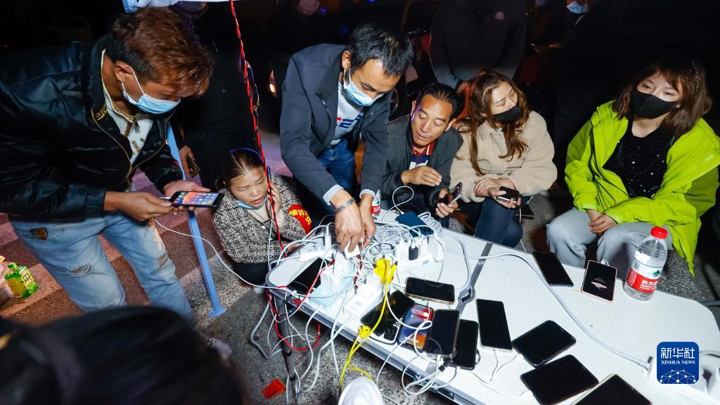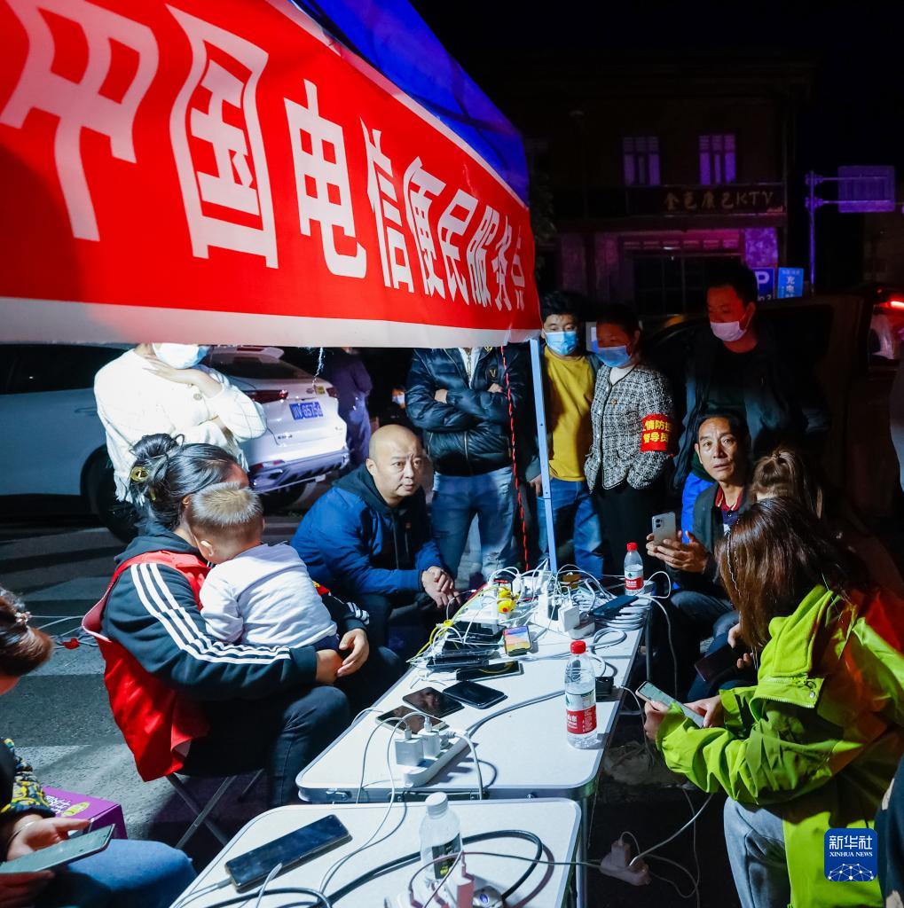 9月5日晚,在四川甘孜州瀘定縣磨西鎮(zhèn)的受災(zāi)群眾臨時(shí)安置點(diǎn),人們?cè)谥袊?guó)電信便民服務(wù)點(diǎn)為手機(jī)充電。新華社 沈伯韓 攝