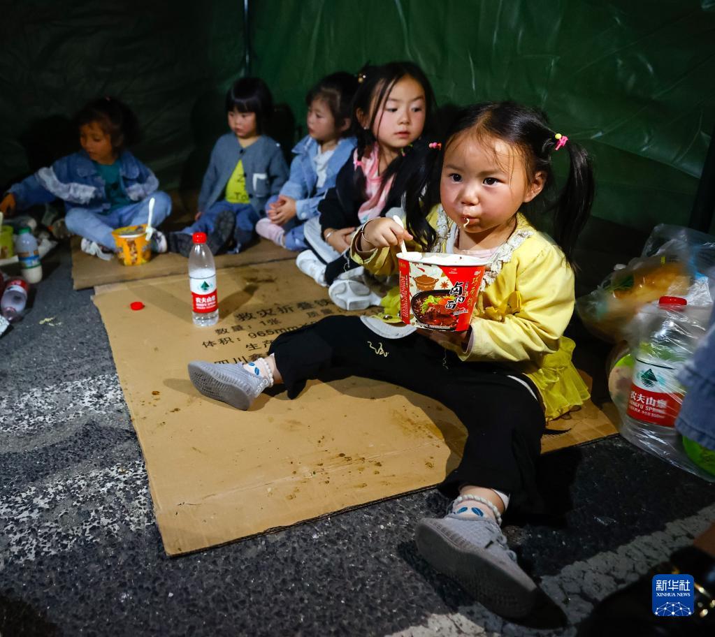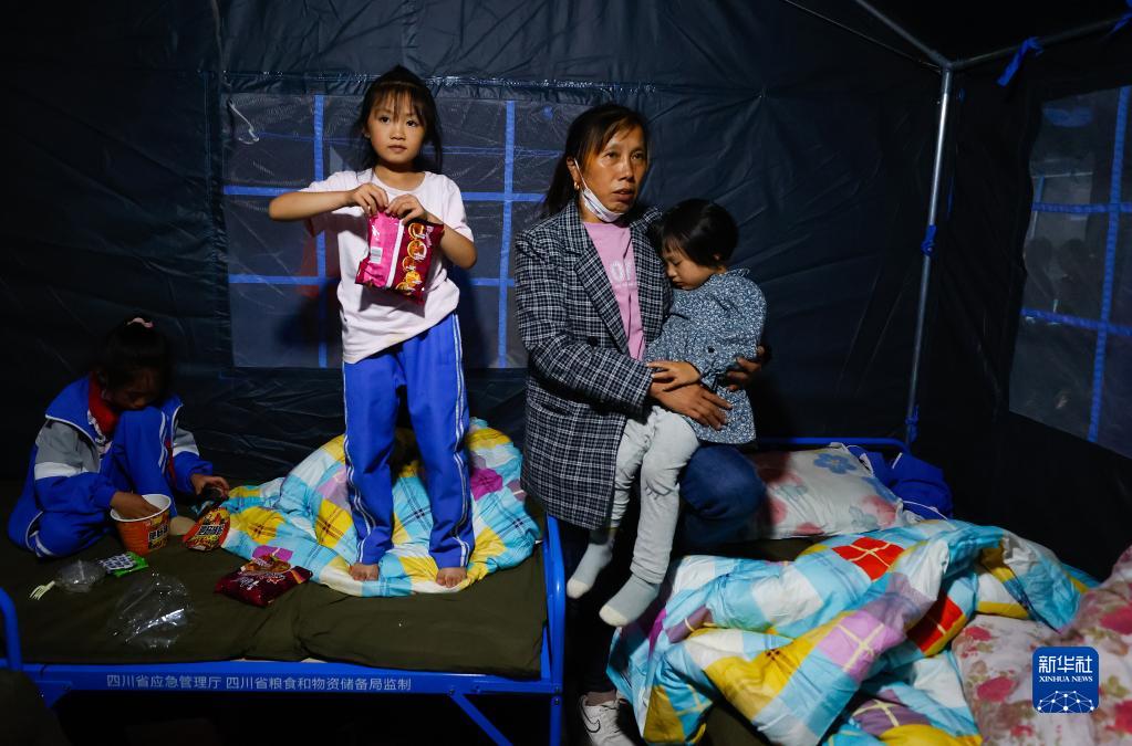 9月5日晚,在四川甘孜州瀘定縣磨西鎮(zhèn)的受災(zāi)群眾臨時(shí)安置點(diǎn),幾個(gè)家庭的孩子們?cè)谝粋€(gè)帳篷里吃飯、休息。新華社 沈伯韓 攝