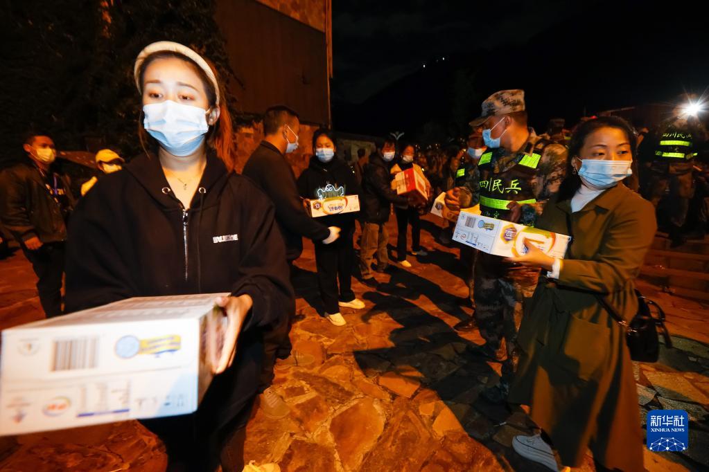 9月5日晚,在四川甘孜州瀘定縣磨西鎮(zhèn)的受災(zāi)群眾臨時(shí)安置點(diǎn),人們?cè)趥鬟f救災(zāi)物資。新華社 沈伯韓 攝