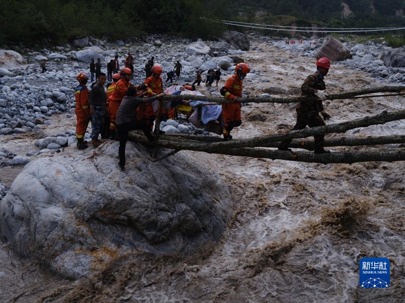 9月5日,四川省森林消防總隊(duì)甘孜支隊(duì)消防員在瀘定縣磨西鎮(zhèn)青崗坪村轉(zhuǎn)移群眾和傷員。程雪力 攝