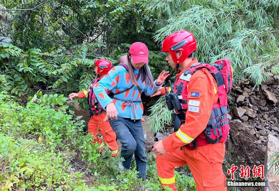 救援人員護(hù)送村民通過垮塌路段,安全下山。譚昊 攝