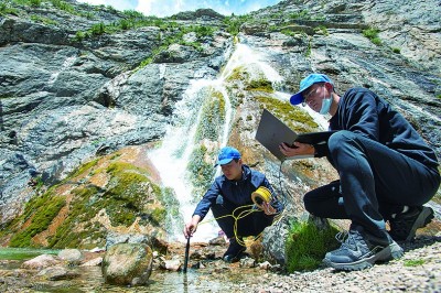 科考隊(duì)員范越(右)與董士琦在瀾滄江源區(qū)的溶洞出水口進(jìn)行水質(zhì)檢測(cè)。