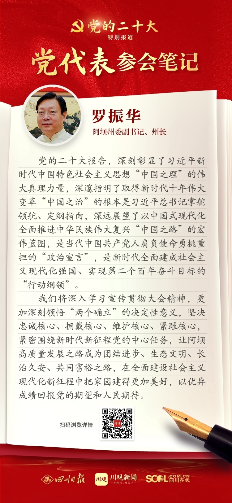 出席盛會,來自四川的黨代表深感使命光榮、責任重大,大家認真履職,結(jié)合報告談認識、談體會、談打算。川觀新聞特此推出“黨代表參會筆記”欄目,分享黨代表們的參會心得,敬請垂注。