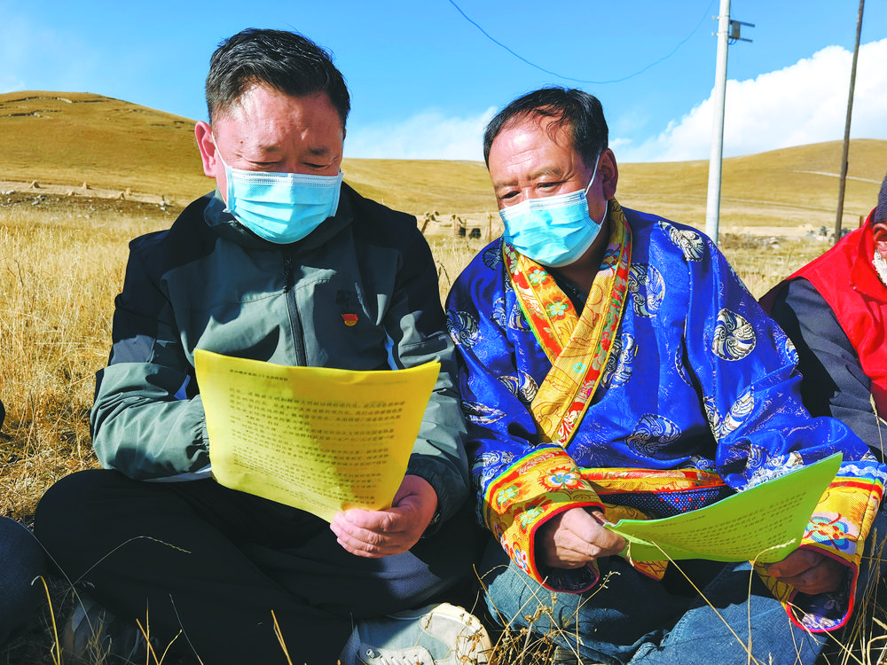 “‘促進多層次醫(yī)療保障有序銜接,完善大病保險和醫(yī)療救助制度,落實異地就醫(yī)結(jié)算,建立長期護理保險制度,積極發(fā)展商業(yè)醫(yī)療保險?!?“馬背宣講隊”成員楊公保,將一份印有二十大報告的宣傳冊,送到杜才貢手里,并把其中和醫(yī)療有關(guān)的內(nèi)容,用筆給他劃了出來。