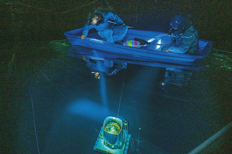 24日,陳明君和同事穿上潔凈服、戴上腳套,劃著小船進(jìn)入伸手不見五指的三號水池,他們要逐一檢查維護(hù)這里的探測器單元和電子學(xué)箱。船劃到指定位置,黑暗中陳明君的頭燈光束直射水底,水下碩大的探測器單元核心設(shè)備——光電倍增管,被照得清晰可見,他和同事一起用“鉤子”把光電倍增管拉起,進(jìn)行檢查?!八乩锏纳疃仁?.5米,這些純凈水的透明度比自來水高三倍以上,切倫科夫光就從里面捕獲?!标惷骶嬖V記者。
