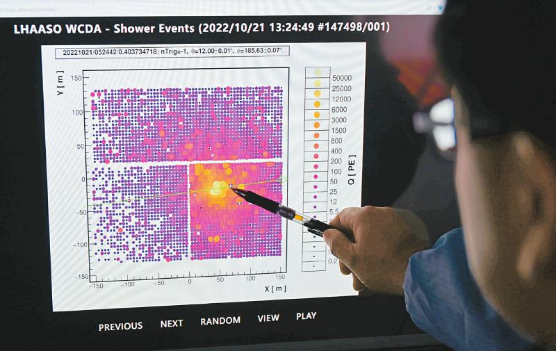 10月21日,科研人員在電腦上展示探測器的時間切片,片中顯示的帶顏色的光點(diǎn),顏色越明亮,表明射線能量越強(qiáng)。