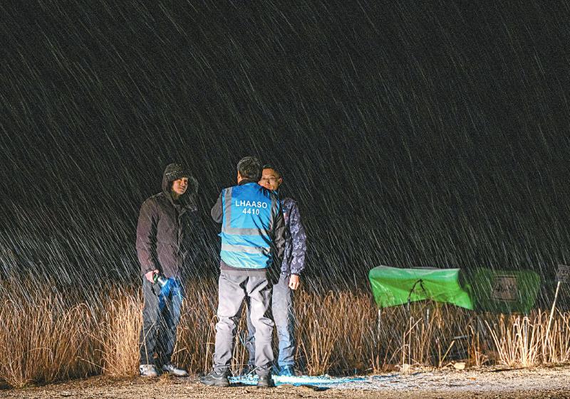 10月24日晚,拉索迎來了今秋的第一場大雪,走出水切倫科夫探測器的陳明君(中)與團(tuán)隊(duì)工作人員討論需要解決的問題。