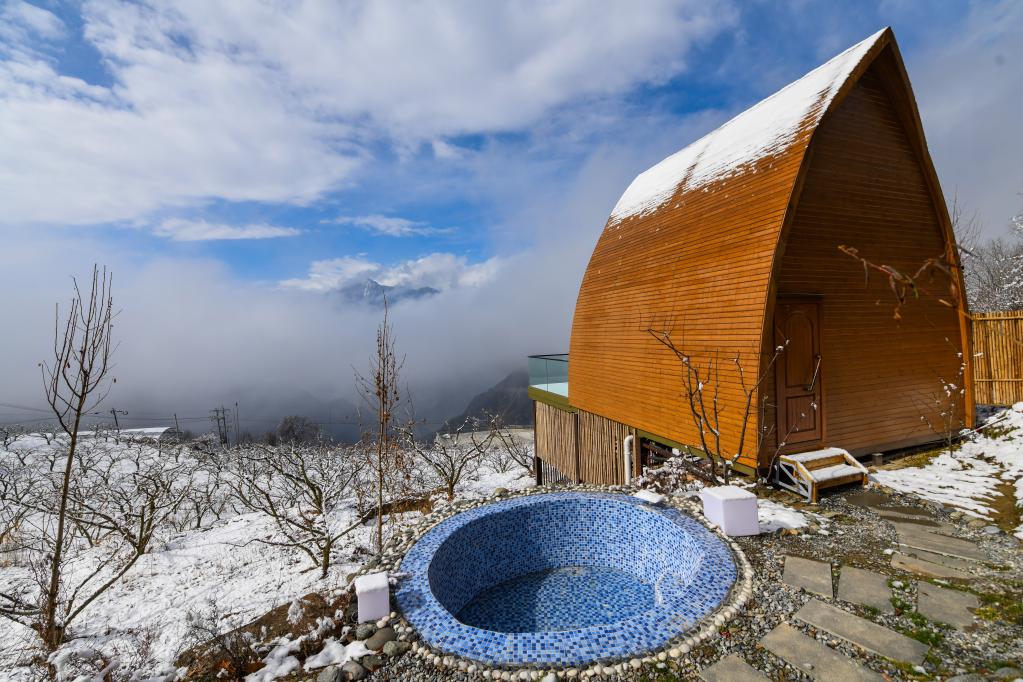 克枯村位于長(zhǎng)江上游支流岷江邊的山腰上,是羌族聚居村寨。記者日前沿盤山公路進(jìn)入村中看到,李子樹(shù)枝干上掛滿雪花,山林里6棟復(fù)式獨(dú)棟木屋民宿與遠(yuǎn)處的雪山峽谷遙相呼應(yīng),旁邊是視野開(kāi)闊的網(wǎng)紅餐廳,沿著旅游步道前行便看到幽蘭深邃的冰瀑群。