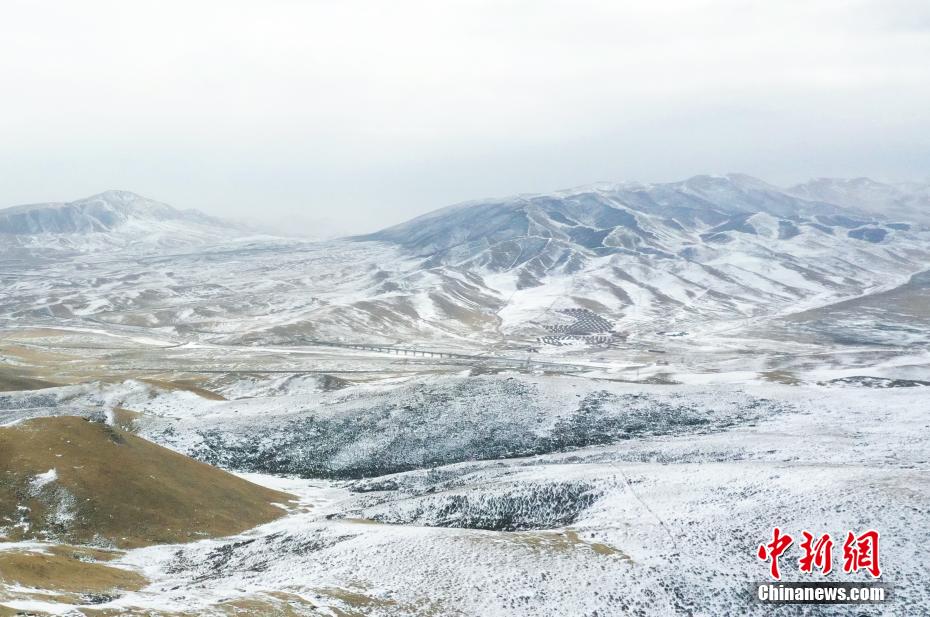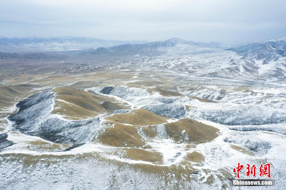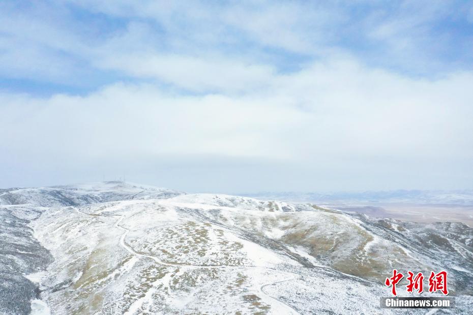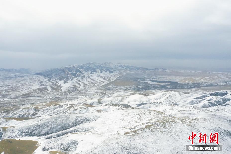 2月17日,航拍位于青海省海北藏族自治州海晏縣,祁連山脈同寶山壯美雪景。一場春雪過后,同寶山連綿的山巒被白雪覆蓋,遠處的青海湖若隱若現,盡顯壯美。