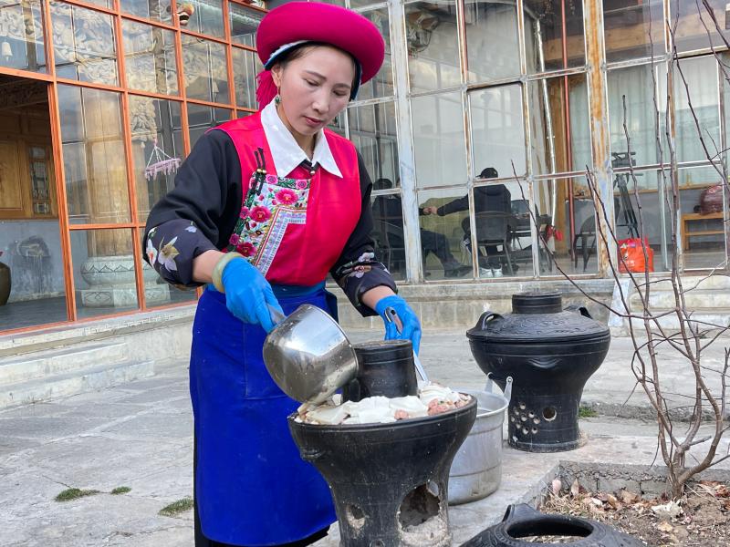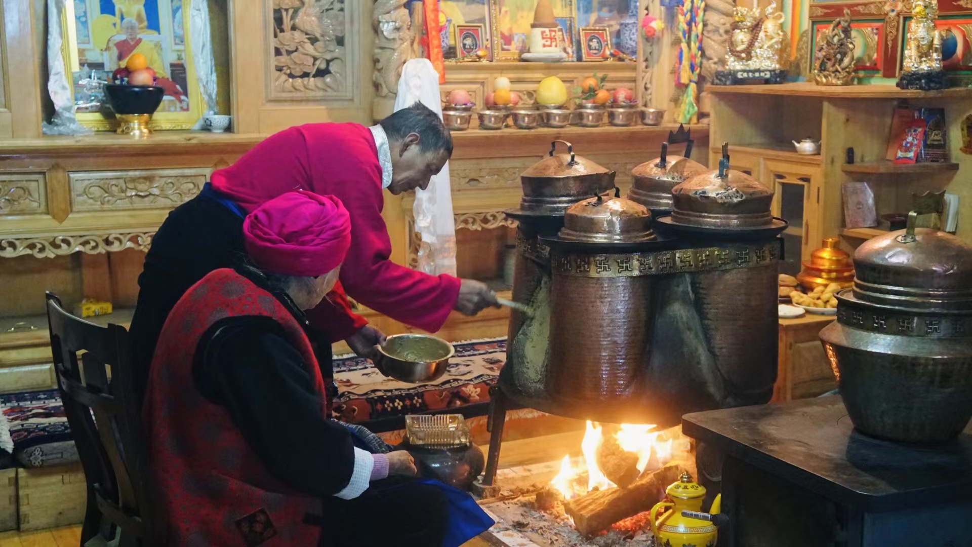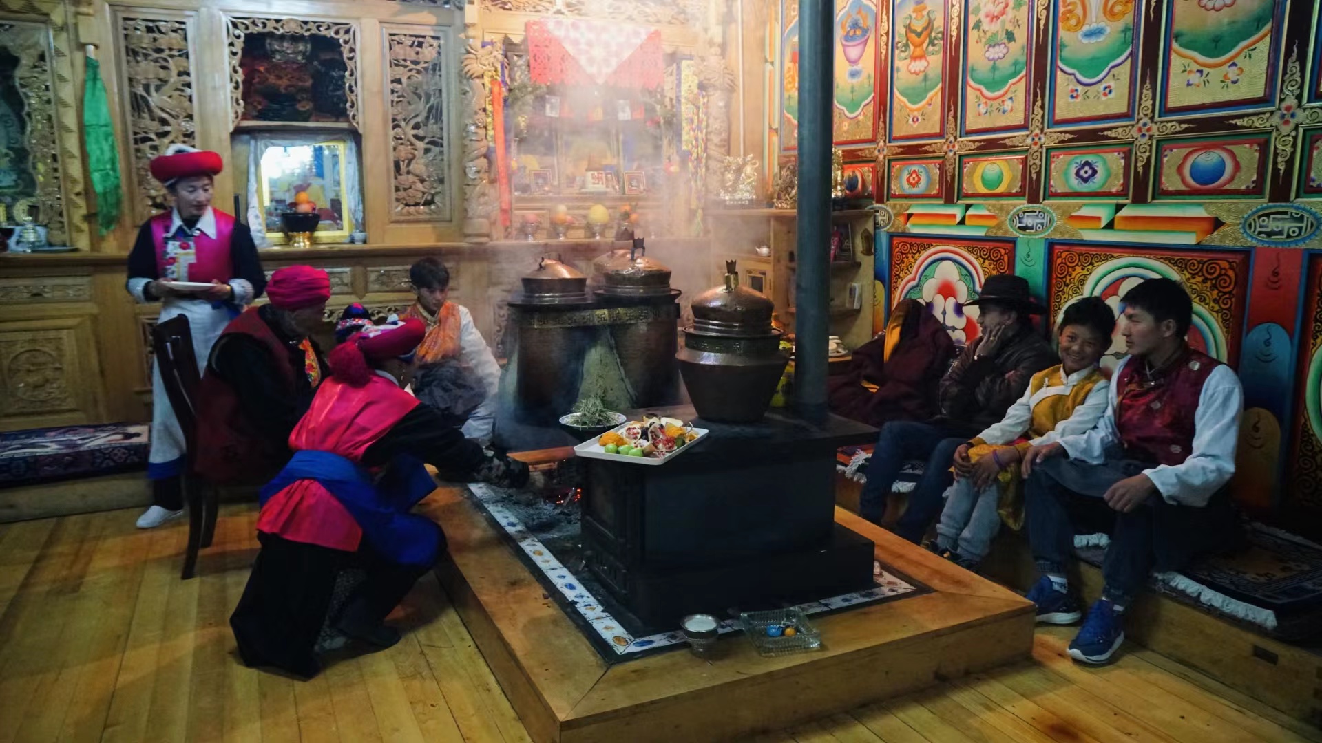 傍晚時(shí)分,“年夜飯”準(zhǔn)備完成,初稱站在火塘邊把剛和好的稀泥一層一層地刷到火塘上,“這是藏歷新年的添新土儀式(藏歷新年接福習(xí)俗),表示我們對(duì)來年日子風(fēng)調(diào)雨順、紅紅火火的美好期待。”初稱把這些傳統(tǒng)習(xí)俗認(rèn)真地教給家里的孩子們。