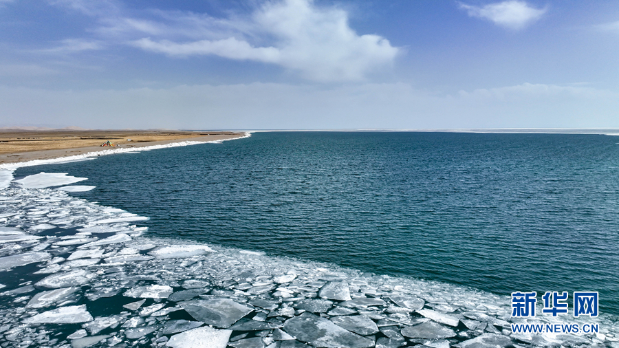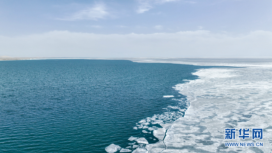 這是4月8日拍攝的青海湖開(kāi)湖景觀(無(wú)人機(jī)照片)。新華網(wǎng) 宋忠勇 攝