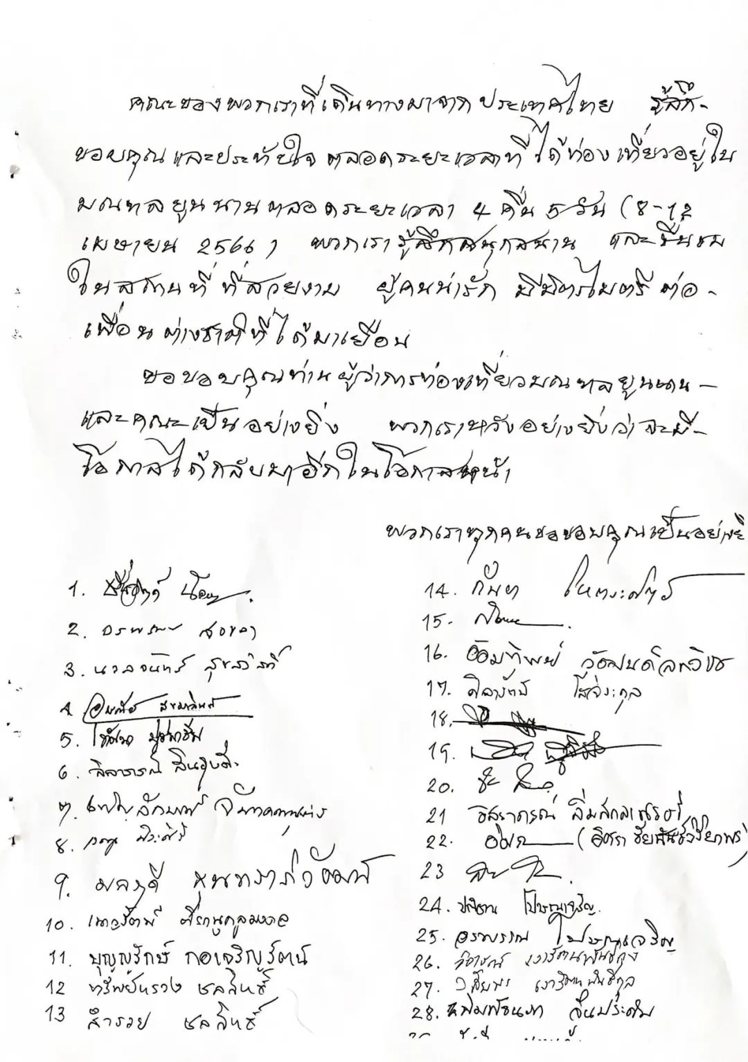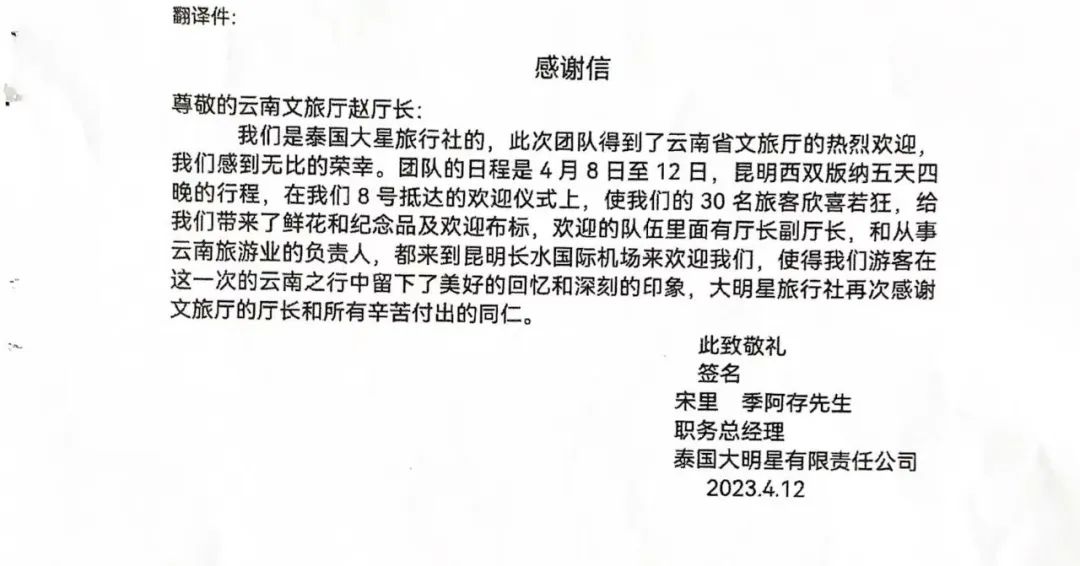 紙短情長(zhǎng)!一封寫有30位泰國(guó)游客名字的感謝信