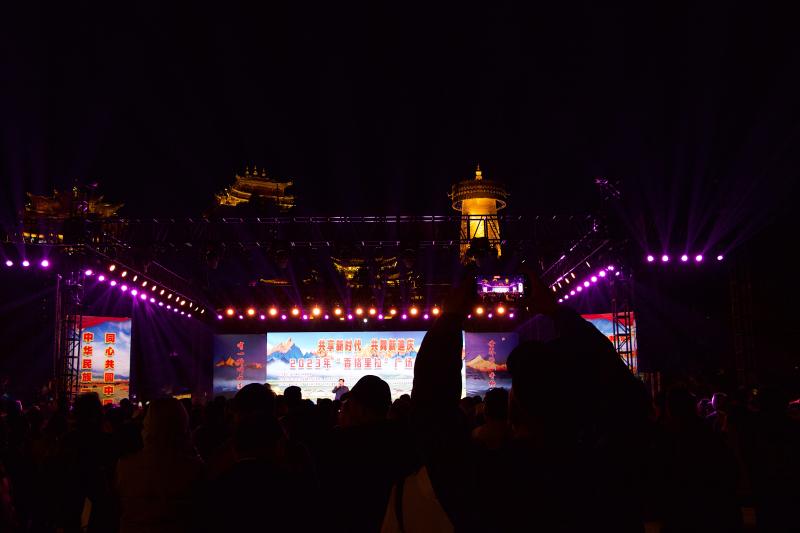 演唱會(huì)結(jié)束后,“彩云之南等你來(lái)”世界的香格里拉歡迎您——夜間群眾文藝演出活動(dòng)隨即開(kāi)始,現(xiàn)場(chǎng)燈光閃爍,游客與當(dāng)?shù)厝罕娨黄穑瑖鴱V場(chǎng)中央的篝火載歌載舞,盡情體驗(yàn)縱情舞蹈的歡樂(lè)。