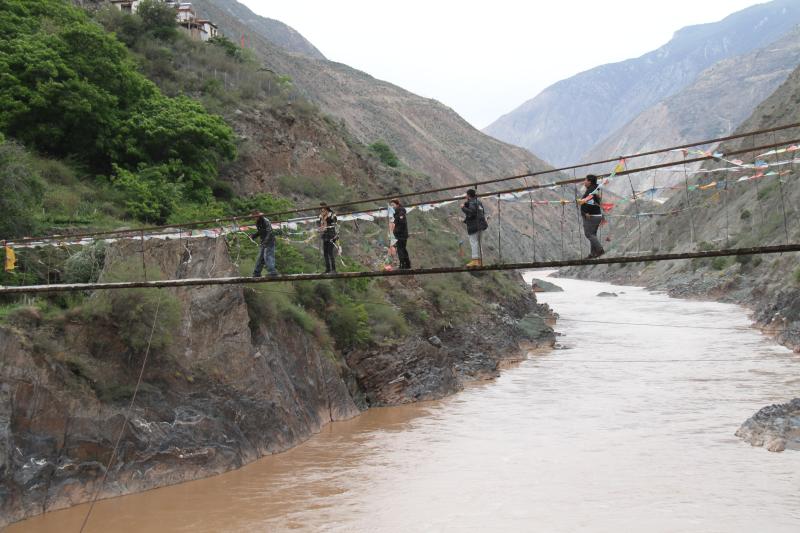 近日,“有一種叫云南的生活”大型調(diào)研采訪活動德欽分隊(duì)十多名來自省內(nèi)外的記者采訪團(tuán)走進(jìn)佛山鄉(xiāng),茶馬古道梅里雪山段瀾滄江上的竹篾溜索、鐵索橋,以及如今還在使用的便橋引起了大家極大興趣。三種渡江方式,代表了三個(gè)時(shí)代的變遷。離此處500米左右下游的鋼筋混凝土大橋則是近幾年建成的,寬約十米的橋面上汽車轟鳴而過。