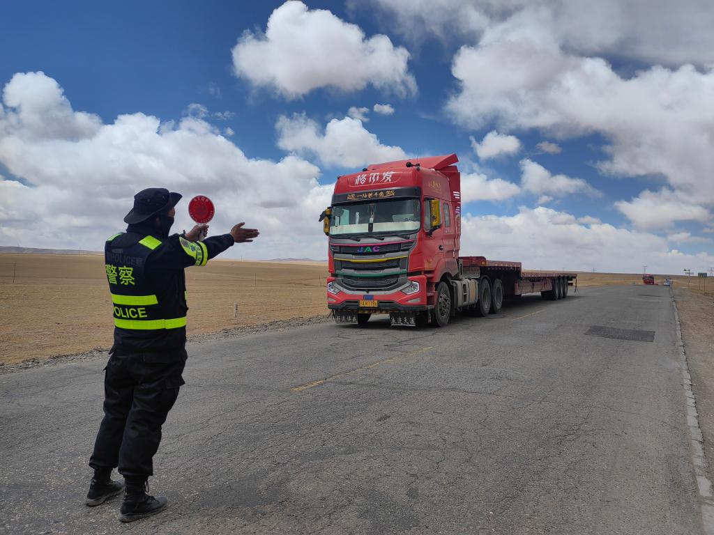 三江源國(guó)家公園長(zhǎng)江源園區(qū)可可西里管理處保護(hù)站工作人員引導(dǎo)車輛避讓遷徙羊群。(三江源國(guó)家公園長(zhǎng)江源園區(qū)可可西里管理處供圖)