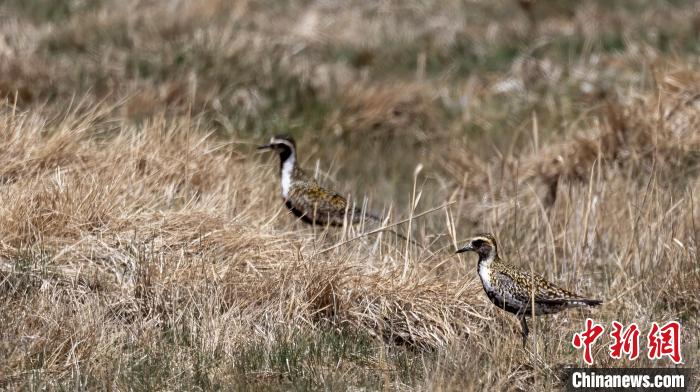 圖為金斑鸻在草叢覓食??唆斂撕兴睾匀槐Wo區(qū) 攝