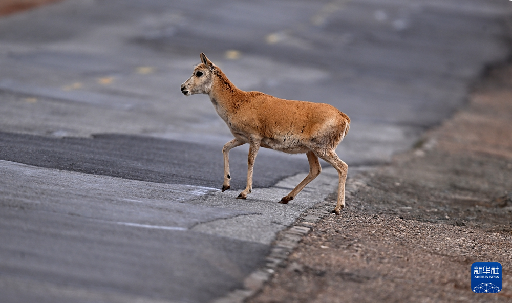 5月28日,在青海可可西里,一只雌性待產(chǎn)藏羚羊通過青藏公路。新華社記者 張宏祥 攝