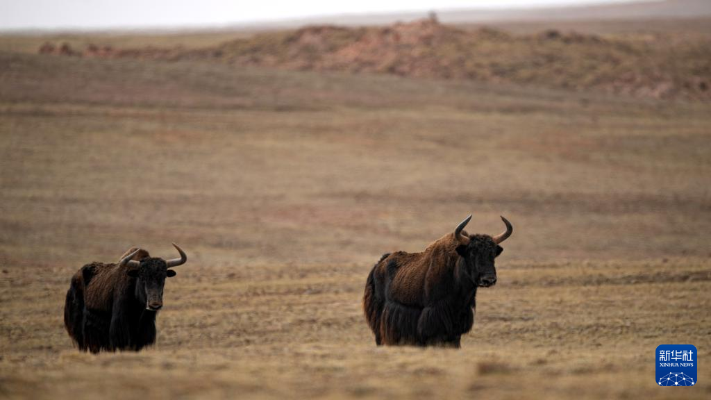 兩頭野牦牛在可可西里卓乃湖區(qū)域活動(6月18日攝)。新華社發(fā) 潘彬彬 攝