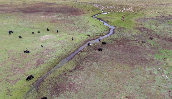 2023年6月8日,青海省玉樹(shù)藏族自治州稱(chēng)多縣珍秦鎮(zhèn)十一村的牦牛在吃草(無(wú)人機(jī)照片)。新華社記者陳杰 攝