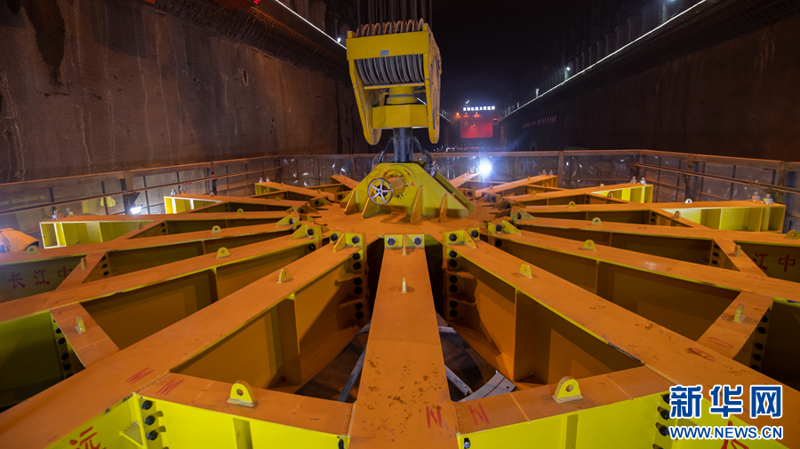 6月30日,瑪爾擋水電站地下廠房內(nèi),工作人員正在進(jìn)行首臺(tái)機(jī)組定子吊裝作業(yè)。新華網(wǎng) 潘彬彬 攝