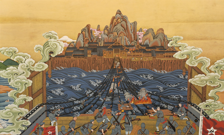 由遠(yuǎn)及近、由高到低、由小漸大,細(xì)觀畫作卷軸,正中間的圖景為:瀘定橋頭紅日高懸,中國(guó)共產(chǎn)黨及其領(lǐng)導(dǎo)的中國(guó)工農(nóng)紅軍主力群像在萬(wàn)丈霞光照耀下群情激昂、豪邁堅(jiān)定;畫作由此發(fā)軔,向四周輻散開來(lái)——中國(guó)工農(nóng)紅軍于1935年5月至1936年7月的15個(gè)月時(shí)間里,在甘孜州境內(nèi)進(jìn)行戰(zhàn)斗、行軍、休整、播撒革命火種、擴(kuò)大黨和紅軍影響、鞏固黨同人民群眾血肉聯(lián)系等諸多廣為流傳的佳話故事由此啟幕。