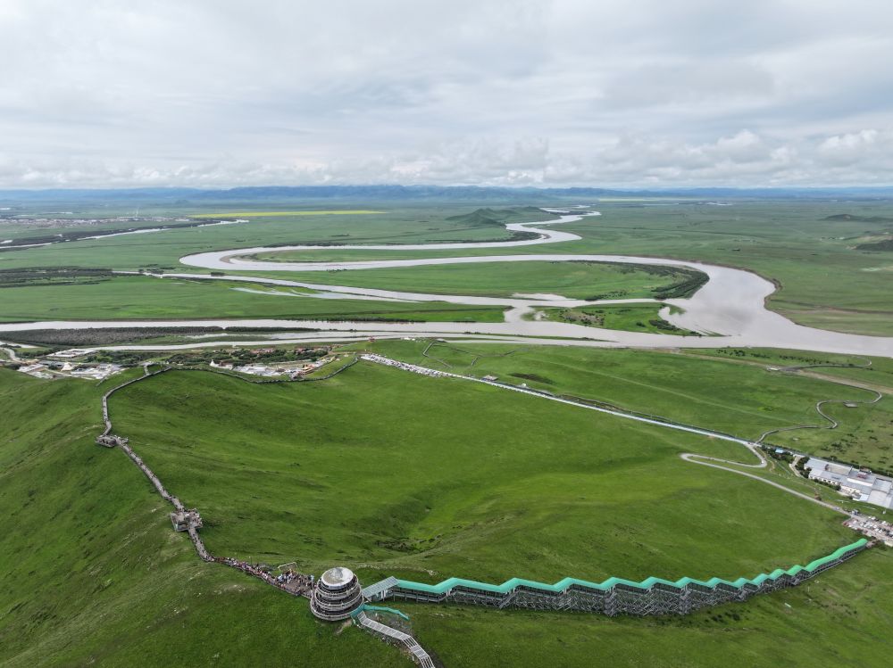 7月14日,游客游覽若爾蓋縣黃河九曲第一灣景區(qū)(無人機照片)。新華社記者 邢拓 攝