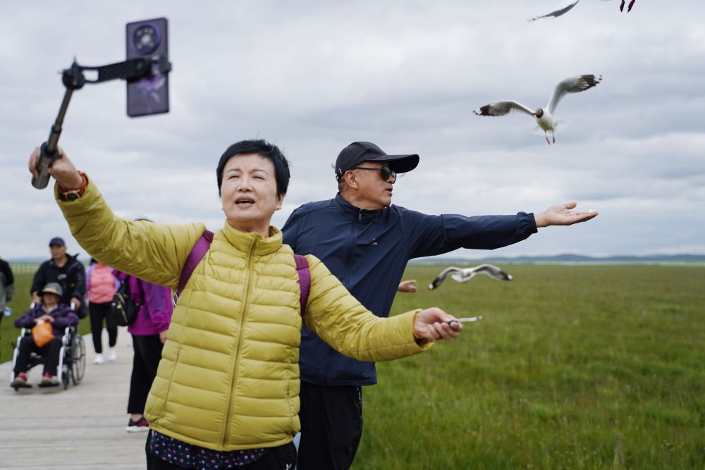 7月14日,游客在若爾蓋縣花湖景區(qū)內(nèi)游覽、拍照。新華社記者 邢拓 攝
