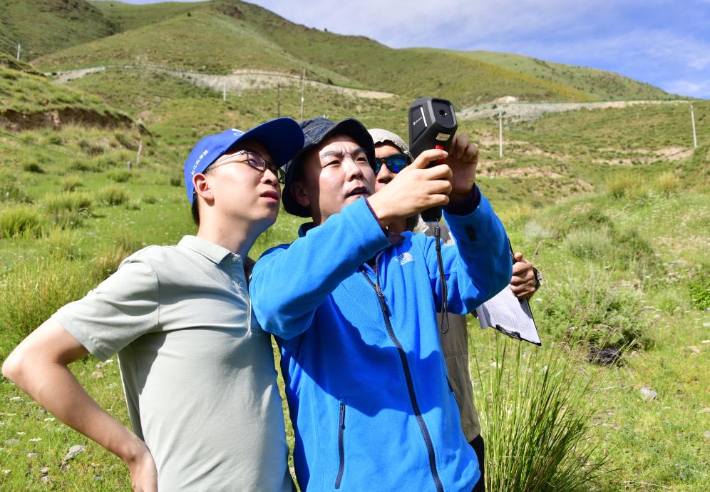 科考隊(duì)員任斐鵬(左二)和隊(duì)友一起用熱紅外儀觀測長江源區(qū)植被熱環(huán)境效應(yīng)。新華社記者 李勁峰 攝