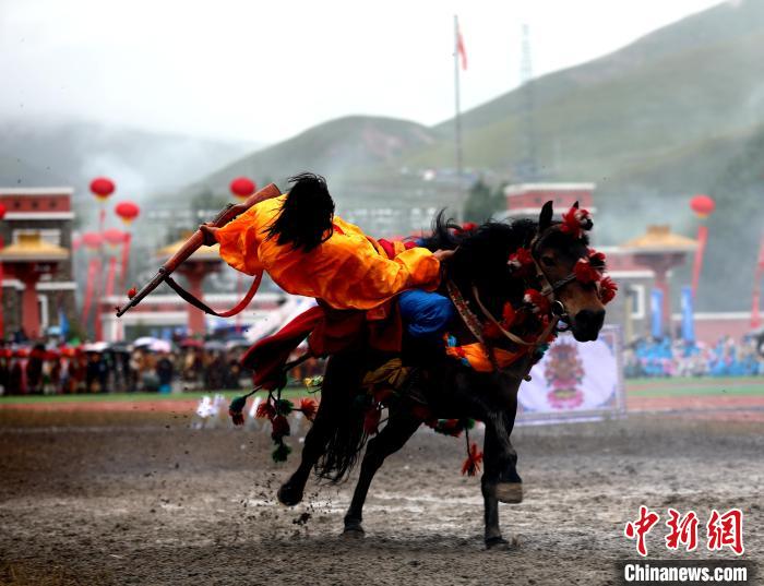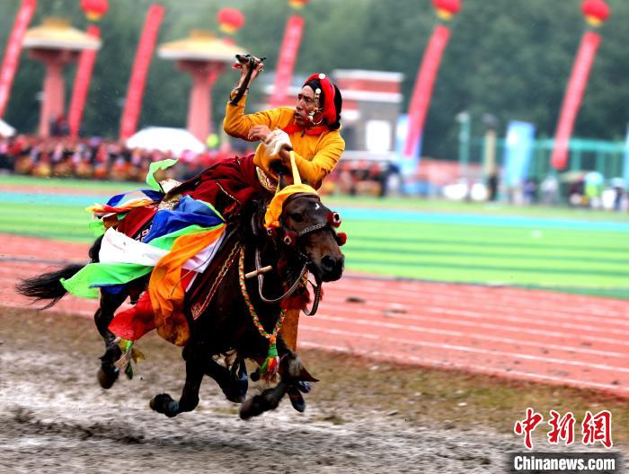 圖為玉樹傳統(tǒng)賽馬會(huì)現(xiàn)場的馬術(shù)表演。薛蒂 攝