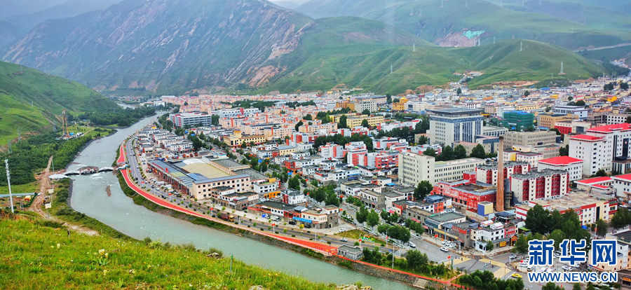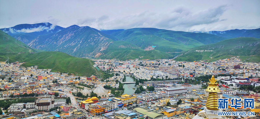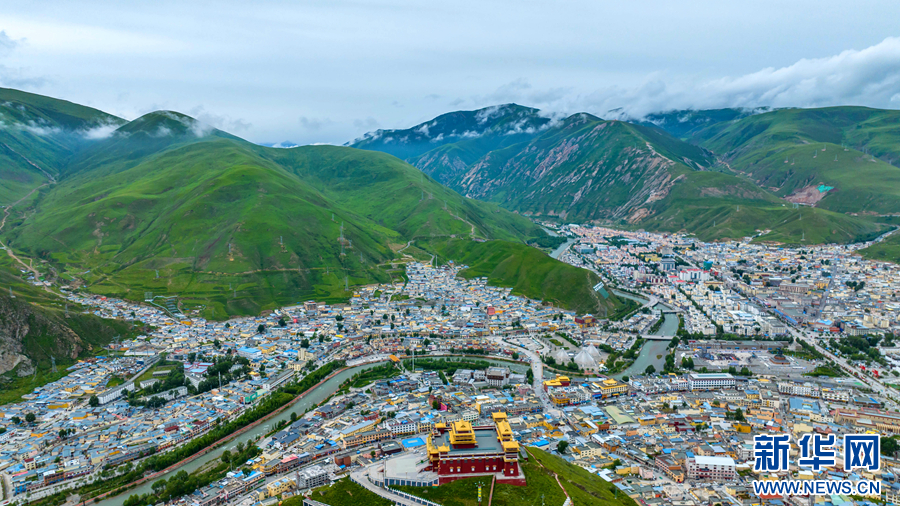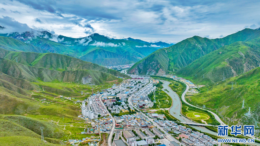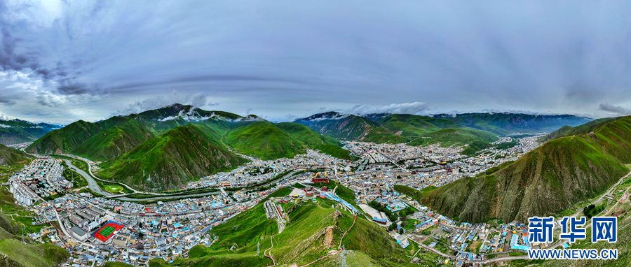 圖為青海省玉樹(shù)藏族自治州玉樹(shù)市的夏日風(fēng)光(無(wú)人機(jī)全景照片)。新華網(wǎng) 宋忠勇 攝